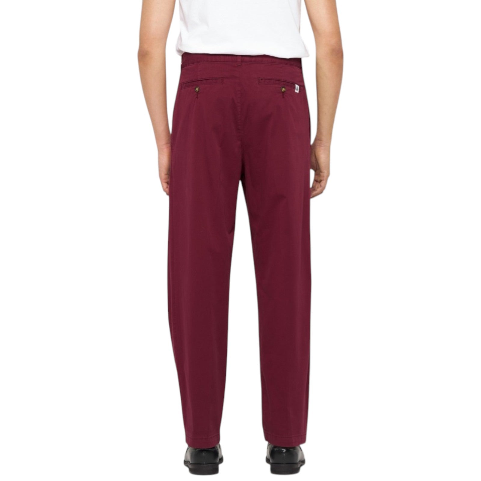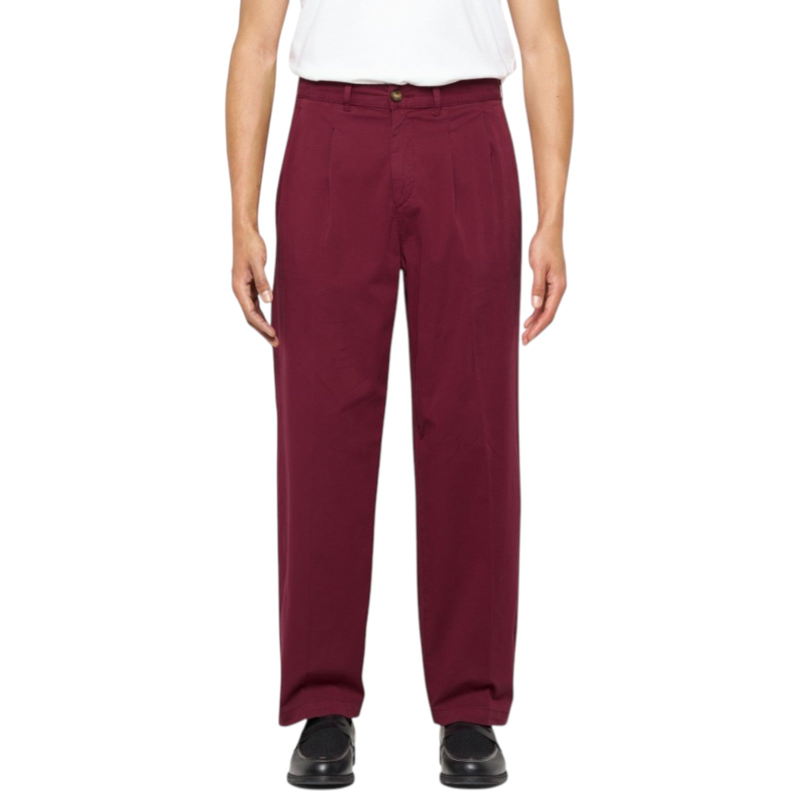 Con dos pliegues marcados en la parte delantera y bolsillos traseros perfilados, los pantalones Sorren ofrecen una reinterpretación elegante y casual del clásico corte de pantalón. Este modelo informal está confeccionado en un tejido de sarga de alta calidad, mezcla de algodón y elastano, caracterizado por un tono intenso de rojo ciruela, y presenta una cómoda silueta de pierna recta.